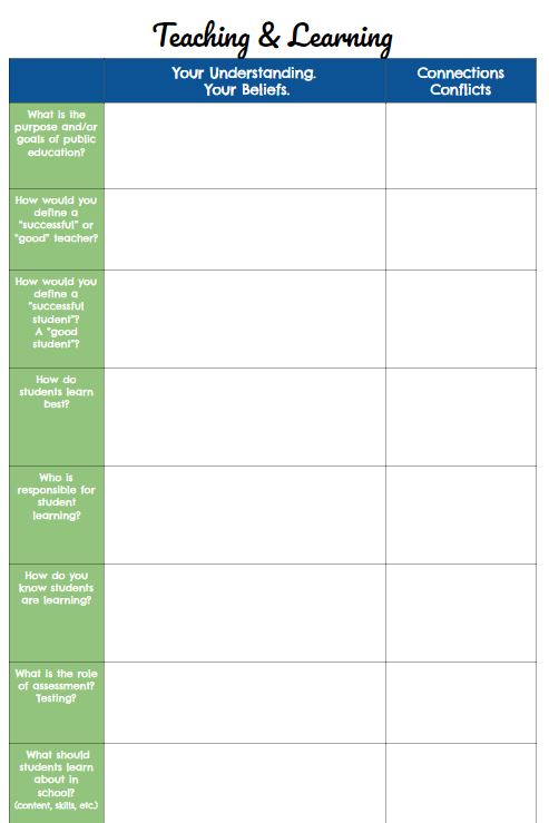 - Belief Based Teaching: Too often, we here the phrase “standards based teaching”. Not to say that there is anything wrong with standards based teaching. In fact, I am a proponent of it. However, before you study and understand the standards, you must study and understand your own beliefs about education. I created a Teaching and Learning document to help probe some thinking. Some questions were ‘What is the purpose of education? Who is responsible for the learning in the classroom? What is the role of assessment? Of testing? How would you define a “good” student?