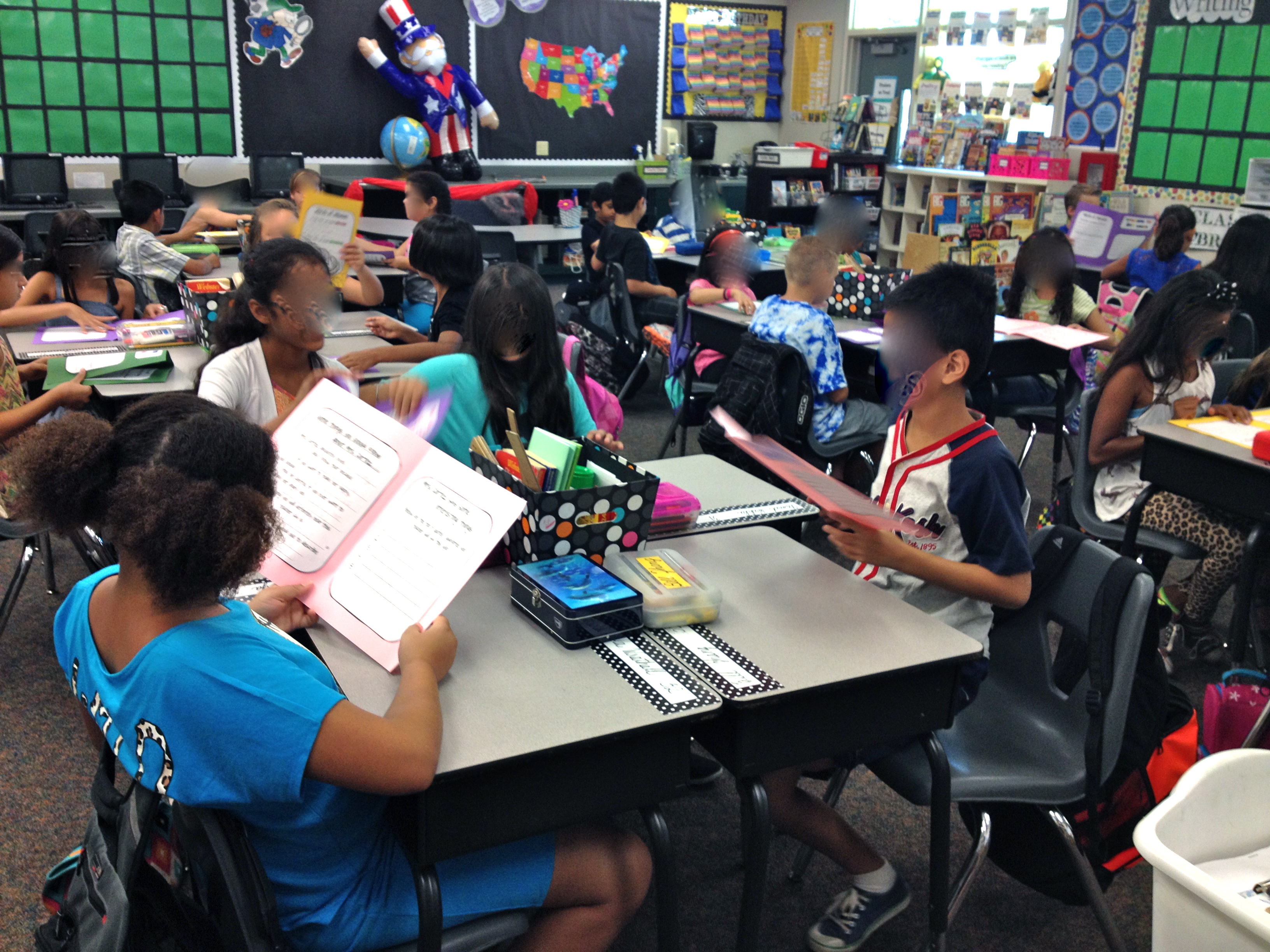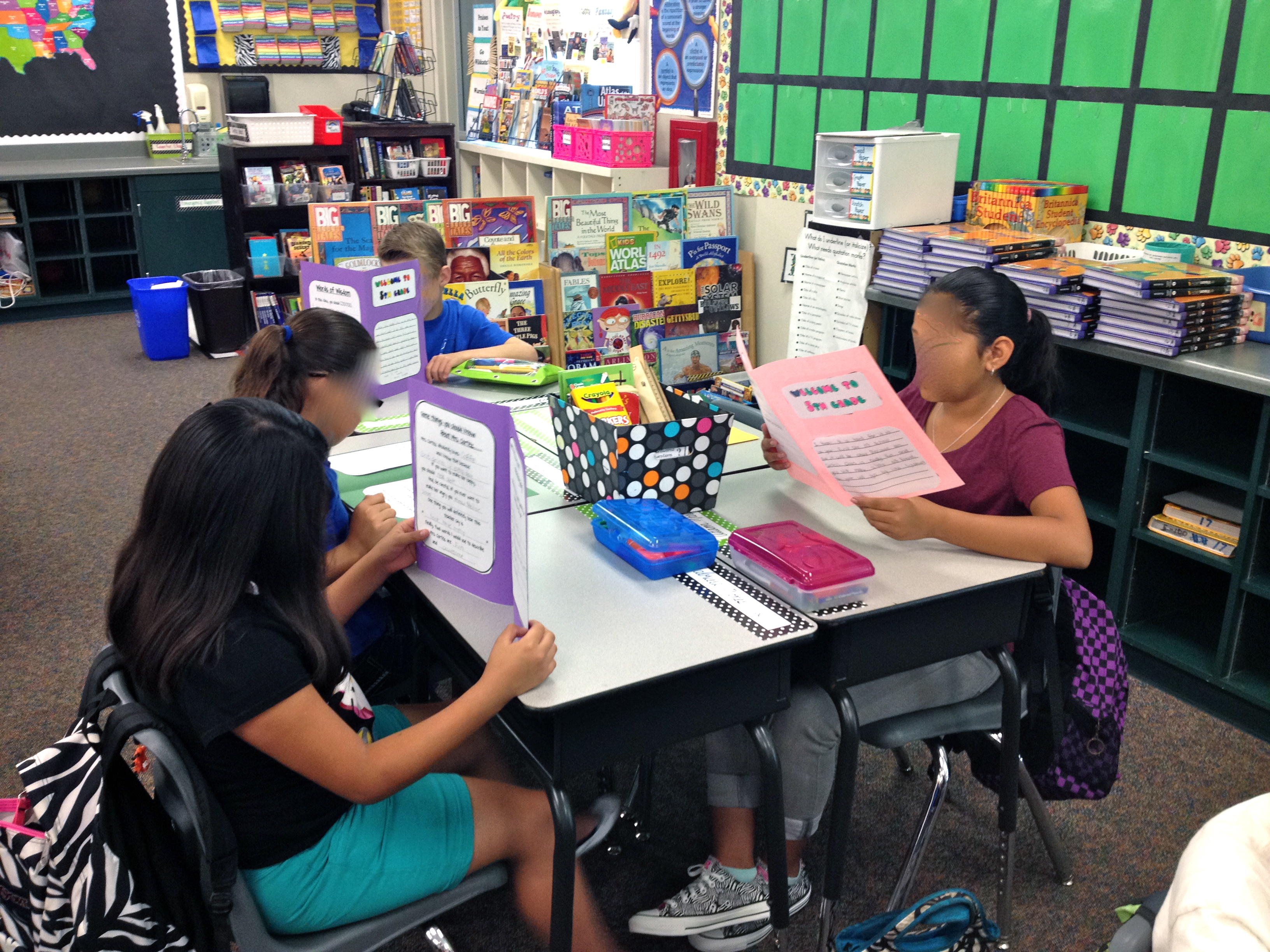 The first activity of the 1st day was our “Welcome to 5th grade” Survival Guides. My previous class made a survival guide for each incoming student. I placed on guide on each student’s desk and we did a Round Robin read. I let each student read a guide for 2 minutes (they weren’t that long) and then yelled “Pass!” so they passed the guide to the person on their left. Another 2 minutes, then “pass”….until everyone had read multiple survival guides. I then had the groups share their thoughts about 5th grade with their team. As they discussed, I placed a small piece of chart paper on each teams’ desks. They had to come up with one prediction statement about their 5th grade year. Some needed sentence frames so I posted them. For example, “I predict 5th grade will be _____ because ______.” Or “After reading these survival guides, I predict 5th grade ________.”