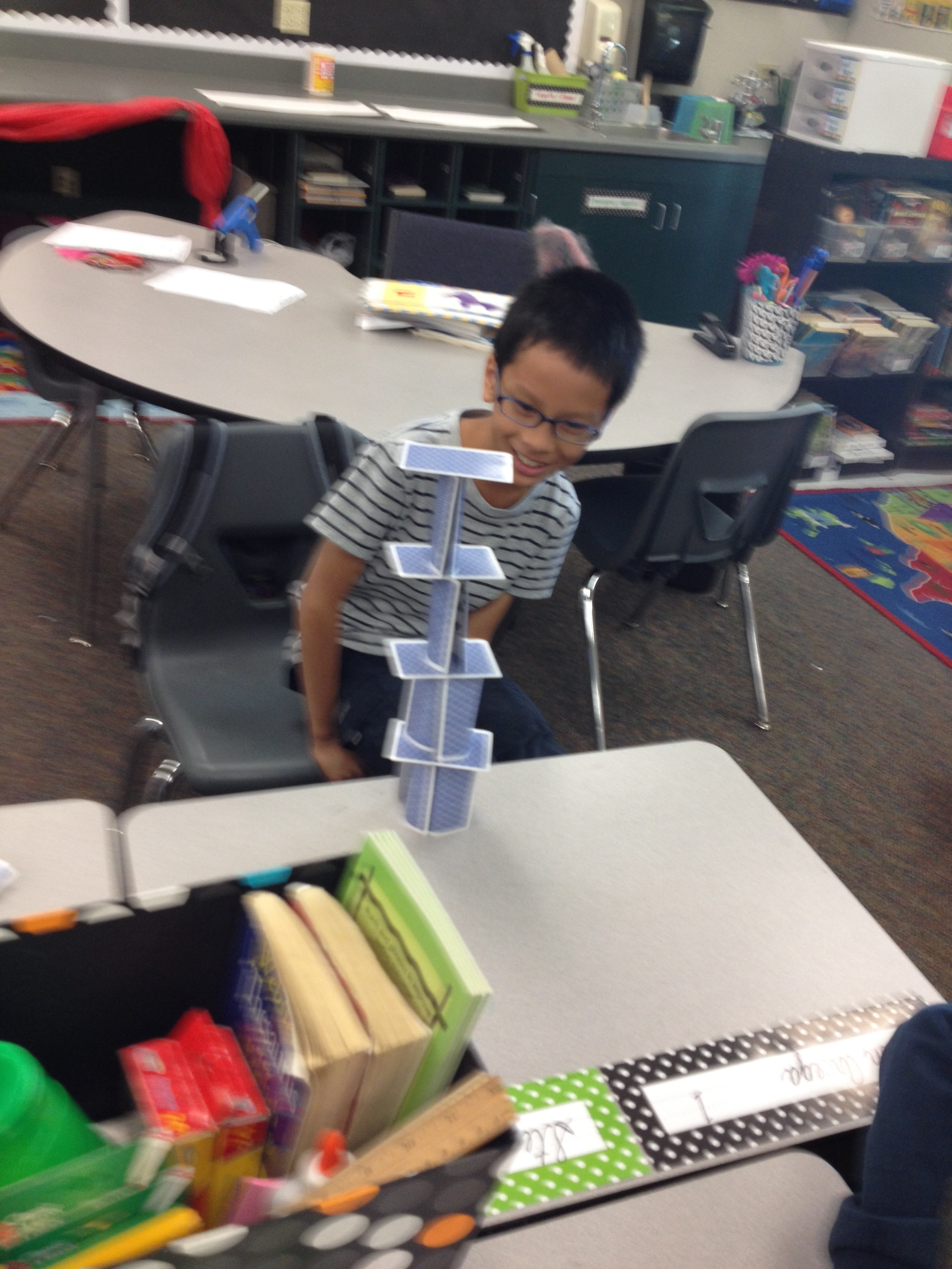 So the first challenge of the year was to use a deck of cards to build the tallest structure. That was it. No other rules except they had to work with their partner. The results are always entertaining. We did this the first day and again on day 2 and 3. The kids, of course, got better and better. I even assigned a follow up for homework: they had to find a strategy of how to build a house of cards, whether that was online or asking a family member. They loved it! And they got better!