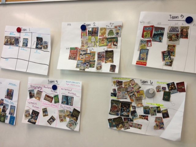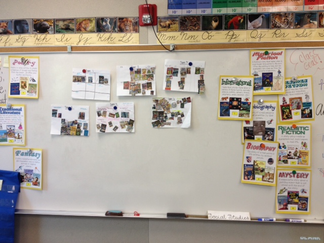 Our first lesson was introducing all the genres (genre hunt) which I blogged about already, but it was really an awesome learning experience for me and the students. Categorizing books according to genre was more difficult then they had anticipated. We are now in the process of sorting the entire classroom library–yikes! and yay!