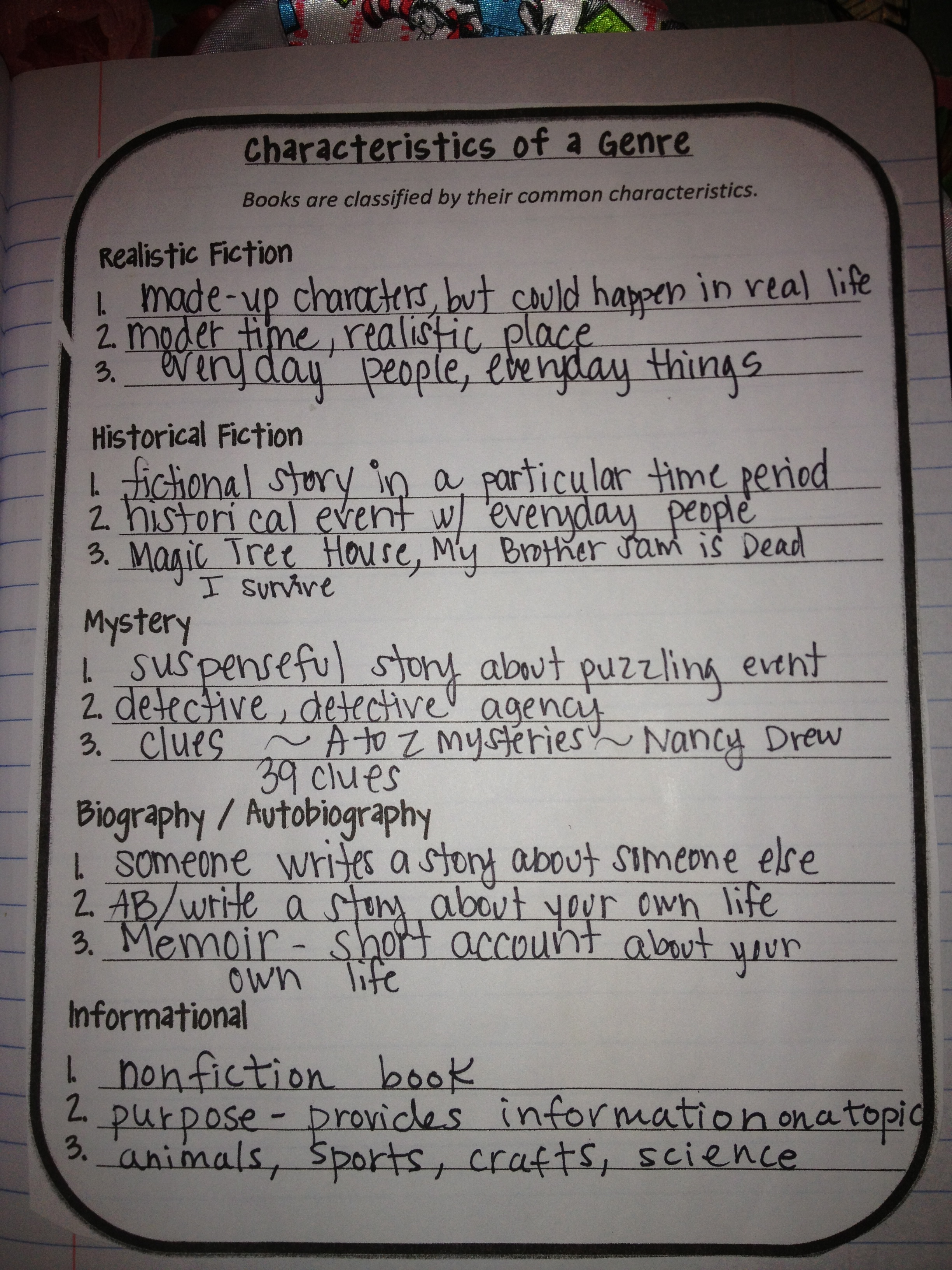 After introducing the book challenge, I passed out copies of the forms to be cut and glued in their notebooks. The forms included genre tally sheet, genre overview, characteristics of a genre (see “genre hunt”), weekly schedule accountability sheet, instructions for weekly response letter, sample of student letter, and more. The package can be purchased in my tpt store- Reader’s Notebook Book Challenge.